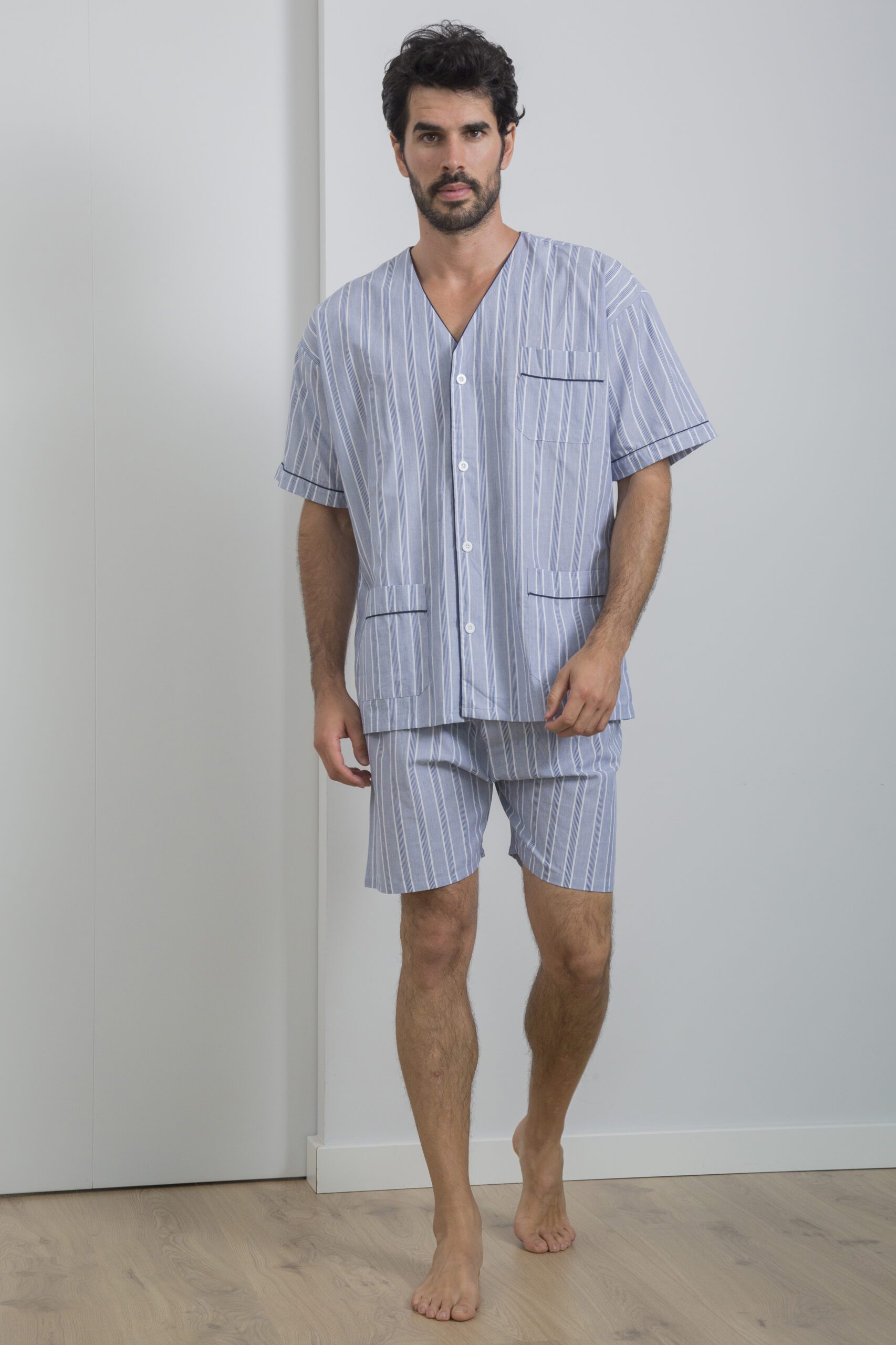 Pijama hombre de tejido popelin de manga corta. Parte superior con botones y a rayas. Pantalón corto a rayas color azul.