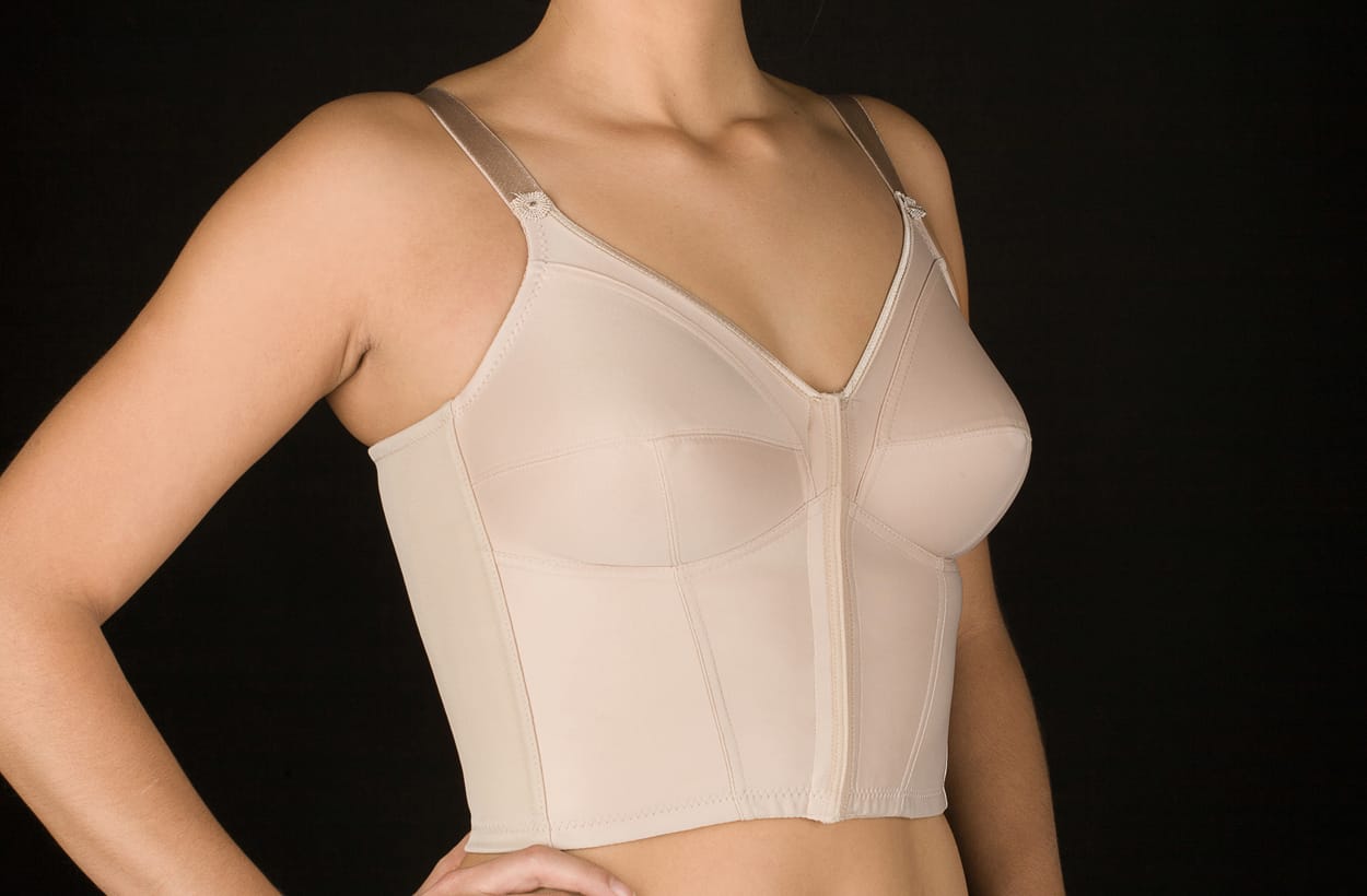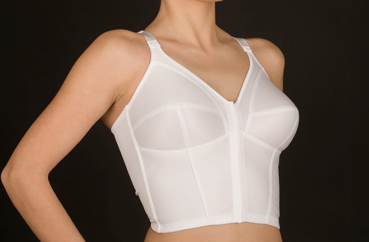 Sujetador de cuerpo sin aros, fabricado en tejido Simplex para mayor sujeción. Apertura delantera.